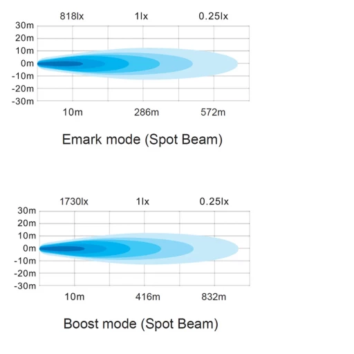 -Reichweite: 658m (0,25 Lx), 329m (1 Lx)