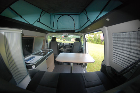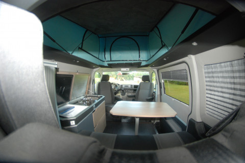 - Два сиденья в жилой зоне с трехточечными ремнями безопасности трансформируются в два спальных места (112x179 см)